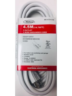 - 4.5 M. ELECTRICAL EXTENTION CORD W/3 OUTLETSSKU - WELL-WE-0-33-4.5HDUPC No. - 063252310785Location - BAY 41CAdd to Wish ListAdd to CompareAvailability - Out of StockPlease click to add to wishlistPieces in cart - 0